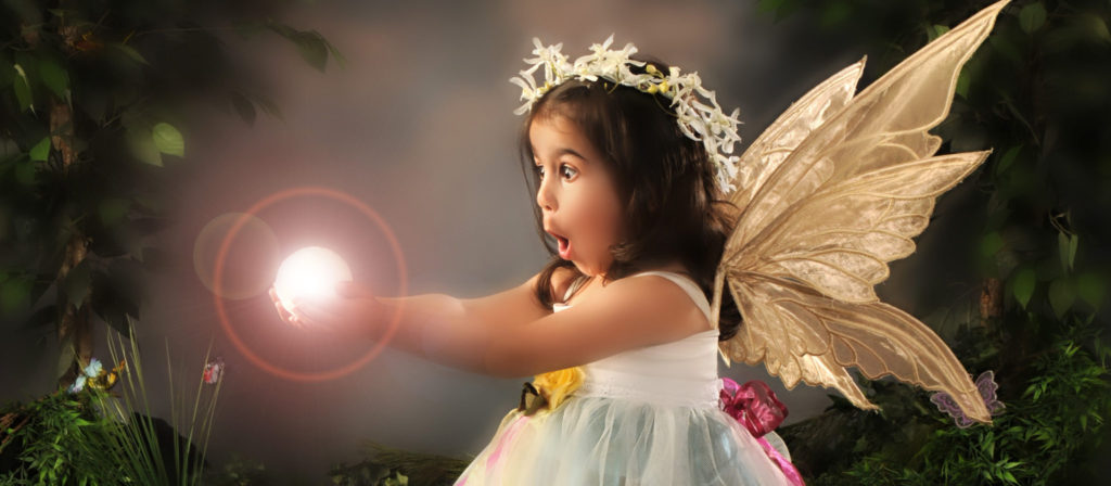 This next one is the coolest. Our young fairies add their touch of whimsy and their  ‘pretend-ability’. They’re looking at a styrofoam ball in the photoshoot. We add the glow effect later. It all works because of their expression.