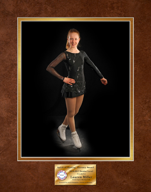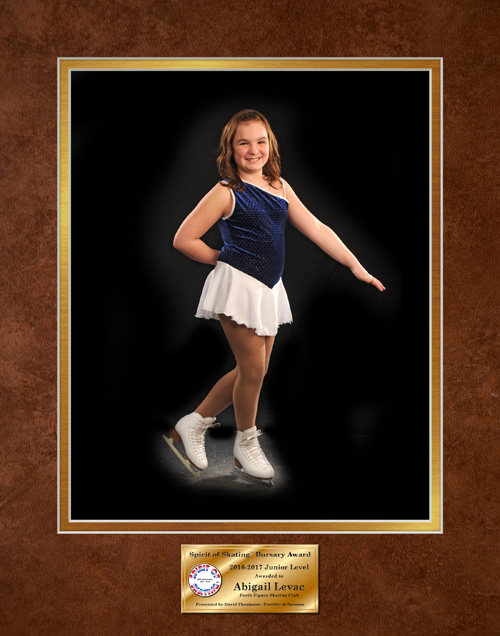This year’s awards went to Abigail Levac (Junior) and Lauren Miller (Senior). We photograph them at our studio and then create a commemorative plaque. The plaque hangs in the display case at the Perth Arena for the following year. It’s then given to the skater as a permanent keepsake of their accomplishment.
