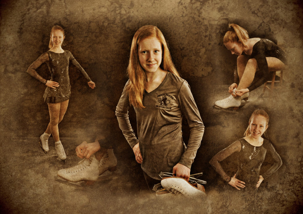 I asked Lauren to bring some other skating related clothing to give me some different looks to work with. Here’s the cool Foto-Fusion montage I created from the studio shoot.